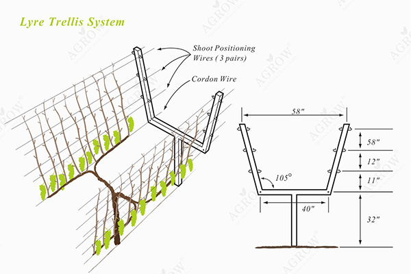 Lyreトレリスシステムは、通常、高収量ブドウ畑で使用され、世界中で広く使用されています。
